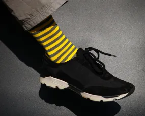 Those socks will be a fine addition to anyone's winter or summer wardrobe. Although the design of the socks is simple, it remains timelessly fashionable and stylish. The color pattern of this pair of socks is unique in its striking contrasts. While the cool colors generate a sense of seriousness, the warm yellow color of the main body complements this sensation and demonstrates a sense of spontaneity. Overall this pair of socks be highly suitable to all those who have a playful spirit under a perhaps serious appearance. But no matter who you are, it is never lame to have a little fun with your socks!